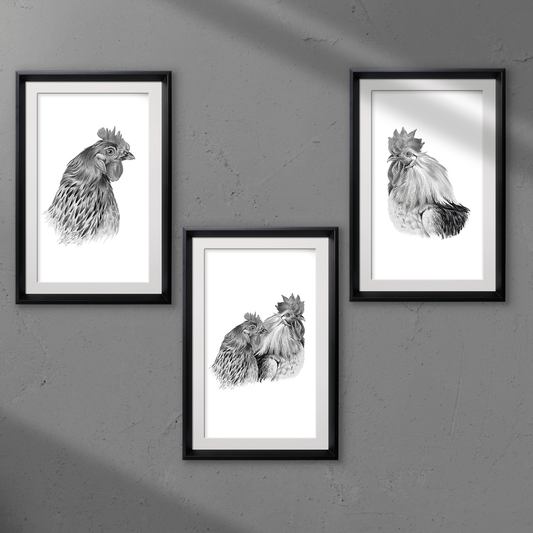 Set of 3 Hen & Rooster Monochrome Pencil Art Prints