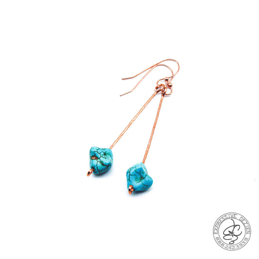 Turquoise and Hammered Copper Chunky Long Skinny Bead Dangle Earrings